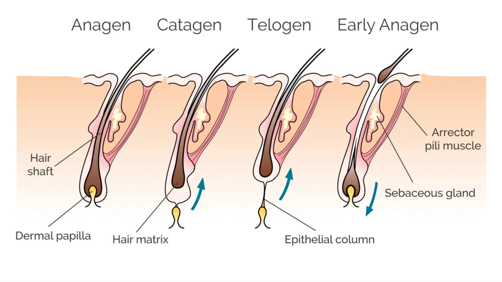 - Φάση Ανάπαυσης: Τα μαλλιά πέφτουν για να δημιουργηθεί χώρος για νέα ανάπτυξη